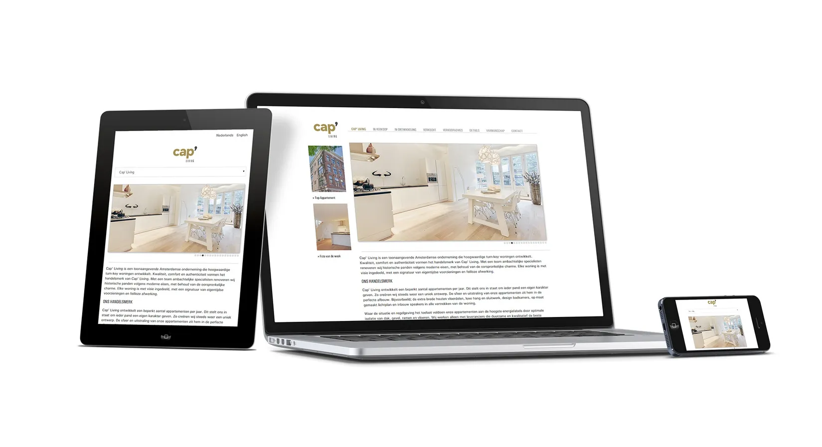 De opdracht was duidelijk. Maak de website volledig schaalbaar op alle apparaten. Net als de woningen van Cap' Living is de website ook een toonbeeld van kwaliteit. Bij het responsive maken is het belangrijk dat een website er altijd goed uitziet.